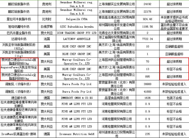 2批次來自標稱澳大利亞進口的德運Devondale奶粉(全脂高鈣奶粉1kg以及脫脂高鈣奶粉1kg)。其生產企業為Murray Goulburn Co-Operative Co.,LTD,未予準入的原因是產品超過保質期。