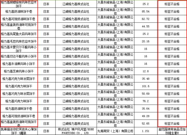 同時榜單中相對較為知名的格力高系列餅干,均因為標簽不合格被查處。