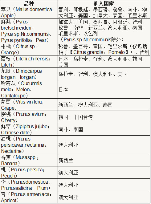 獲得其他國家/地區(qū)檢疫準(zhǔn)入的出口新鮮水果名錄
